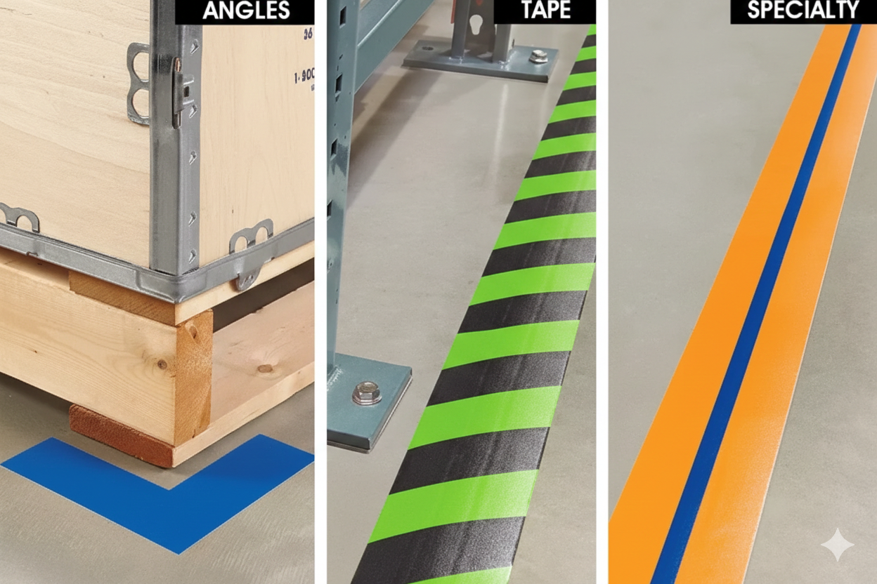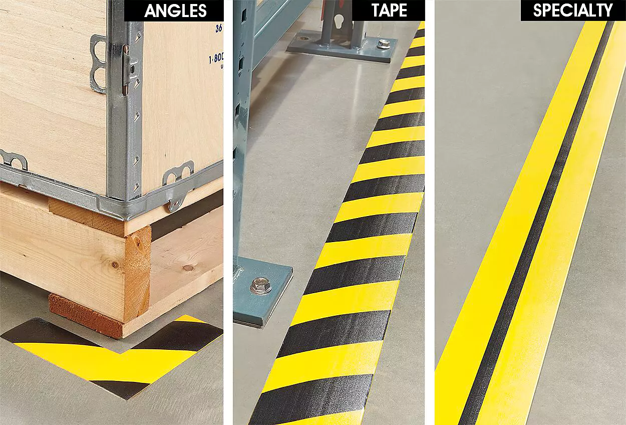 Guaranteed to withstand your roughest warehouse traffic. Beveled edges prevent tearing by forklift trucks or floor scrubbers. Easier to apply than paint. Heavy-duty PVC tape. Sticks tight, removes cleanly. Angles – Precut corners indicate pallet location. Specialty – Center stripe identifies walkways or pathways for AGVs.