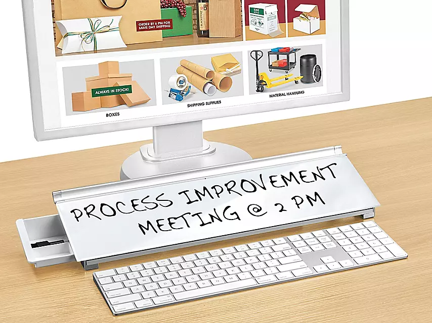Jot down notes and capture ideas while working at your desk. Pull-out drawer stores markers and paper clips. Glass writing surface will not ghost or stain. Includes 1 dry erase marker. Additional Dry Erase Markers and Accessories available.