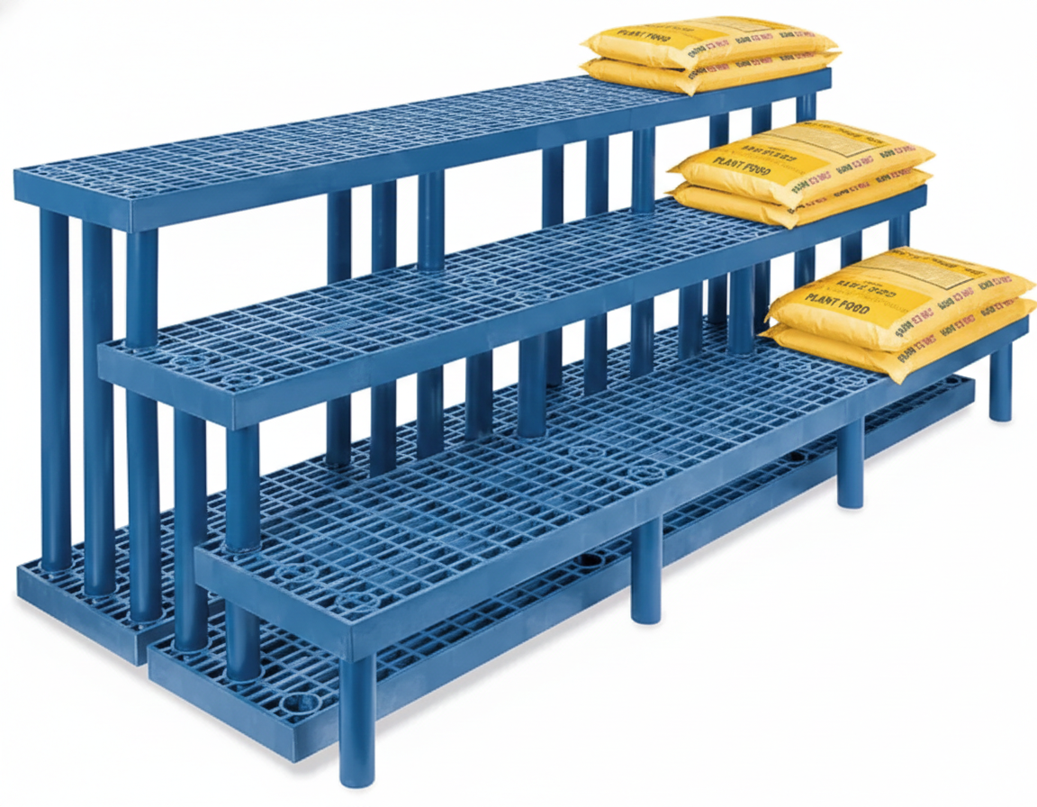 Outdoor or indoor. Quickly set up your product displays. No tools required. Vented shelves prevent dust and dirt buildup. 100% recycled plastic.