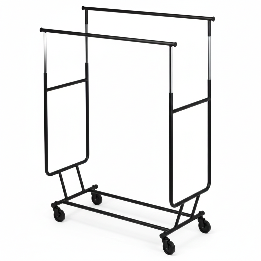 Every office, store and home needs one! Holds double the amount of garments. Sets up fast for winter coats and easily collapses for summer storage. 48″ hangrails expand with two 12″ pull-out rods. Adjustable height for longer garments.