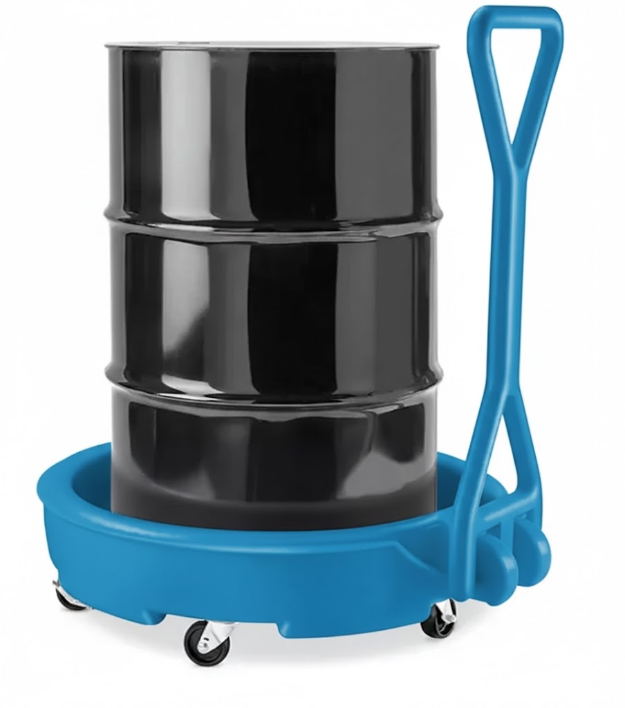 Move big, leaky drums across busy facilities and factories. 5 polyolefin swivel casters, 2 locking. Handle locks upright. Chemical and corrosion-resistant HDPE. 12-gallon basin with 4″ lip. One size fits all. Holds drums up to 95 gallons.