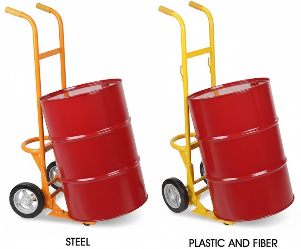 Drum Truck – Plastic and Fiber Drums: Adjustable 2″ polyester strap. Extra-wide feet hold drums secure.