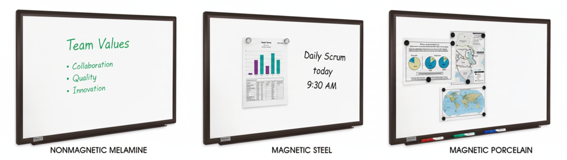 NONMAGNETIC MELAMINE – White melamine surface resists scratching. Aluminum frame. Marker included. MAGNETIC STEEL – Tough surface, lasts for years. Aluminum frame. Marker included. Additional Dry Erase Markers and Accessories available.MAGNETIC PORCELAIN – Lasts a lifetime. Won’t stain, scratch, or ghost. Aluminum frame. Includes four markers.