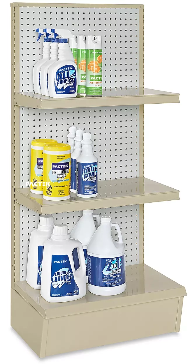 Effective, low-cost product displays for pharmacies, convenience and hardware stores. Steel base with 1/4″ thick MDF pegboard panel. 9/32″ diameter holes are 1″ apart. Assembles in minutes. No tools required. Shelves – Durable powder-coated steel. Built-in price channel. 75 lb. capacity.