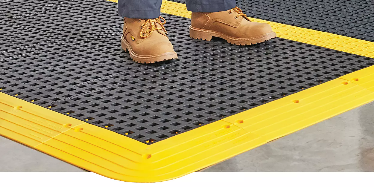 Modular flooring can be custom-fit around machines. Patented interlocking system keeps beefy 7/8″ tiles connected. Easy on, easy off ramps for carts and pallet jacks. 100% PVC resists oil and chemicals.
