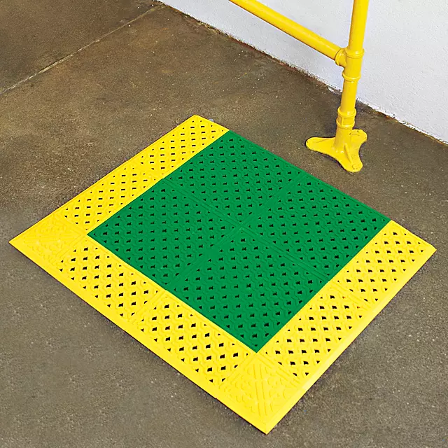 Quickly identify eye wash stations with this highly visible anti-slip mat. High traction, fast draining surface. Durable chemical-resistant PVC. Meets OSHA requirements.
