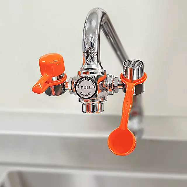 Turn any faucet into an emergency eyewash station. Single faucet with easy pull-knob. Flip-top dust covers. No plumbing required. Easy-pull knob activates eyewash.