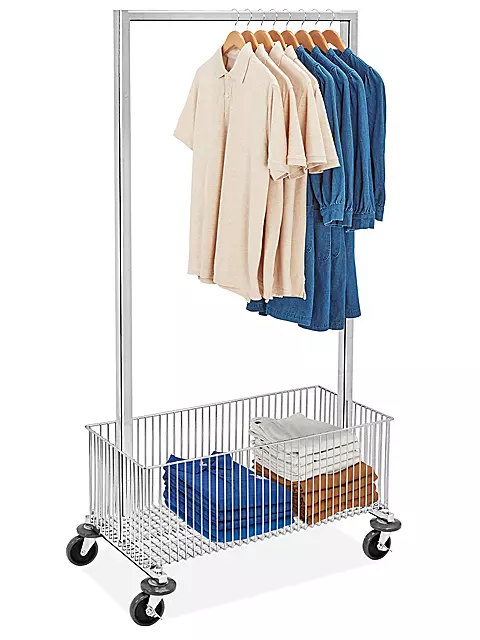 Roll the “no-gos” back to the sales floor. A must-have for retailers, schools and salons. Extra-wide lower basket holds clothing, shoes and accessories. Hang bar holds up to 15 jackets. 4″ poly swivel casters, 2 locking.