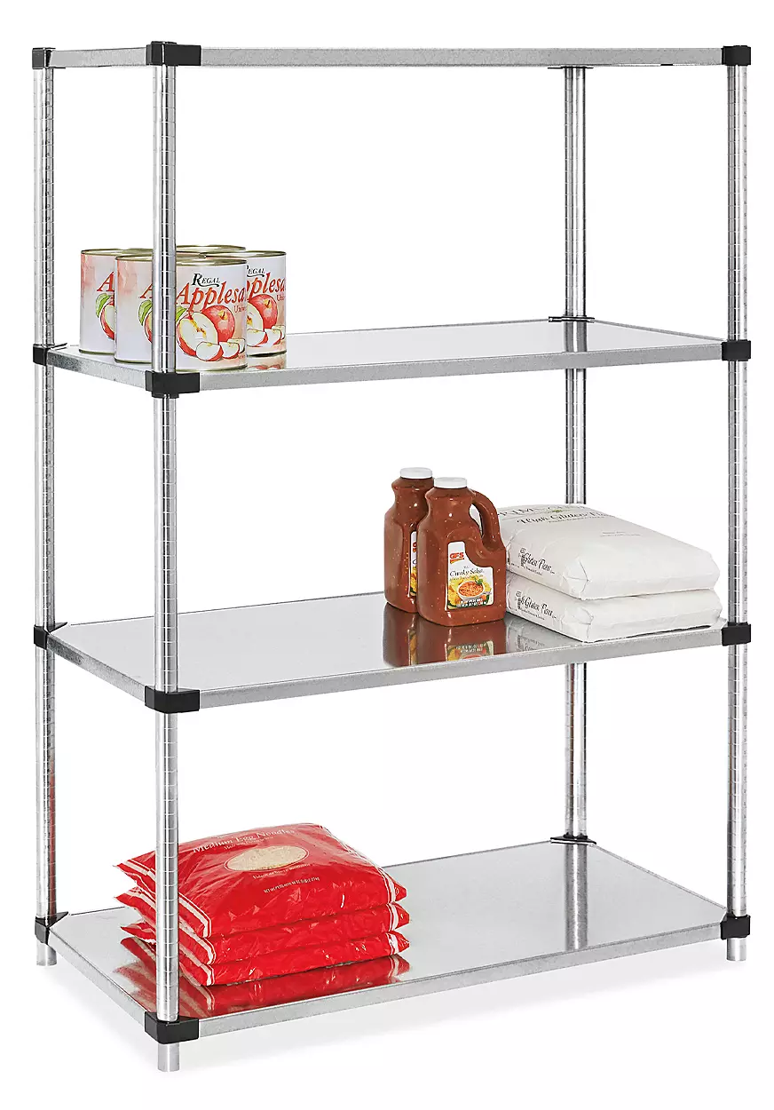18-gauge, galvanized steel shelves. Raised edges help contain spills.