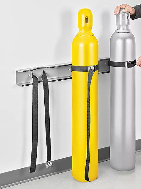 Easy-to-use tank storage. Polyester straps with steel buckles hold tanks in place. Cushioned bumper guards for scratchless grip. Fits 4-12″ diameter cylinders. Meets NFPA and OSHA Standards. Mounting hardware not included.