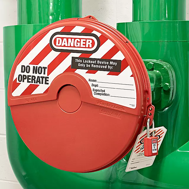 Surrounds and locks valve handle to prevent accidental opening. Rotating design for easy installation in tight spaces. Resists chemicals and extreme temperatures. Includes reusable write-on labels. Lockout Padlocks and Tags sold separately.