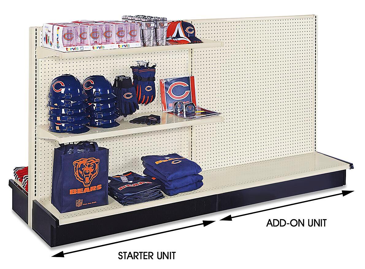 Double-Sided Units – Display product on both sides in hallways and main aisles. (2) 16″ shelves included.