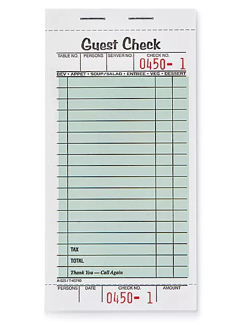 Take customers’ orders quickly and easily. Recommended for bars, cafés and small repair shops. Consecutively numbered for recordkeeping. One-part pad. Perforated stub serves as a guest receipt.