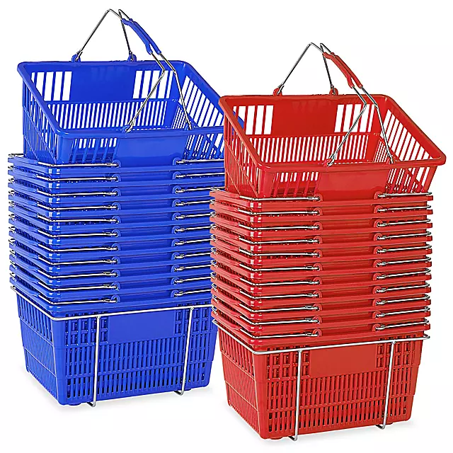 Customer convenience that pays for itself. Includes 12 baskets, sign and steel stand to hold baskets. Durable metal handles with comfort grip. Break-resistant plastic.