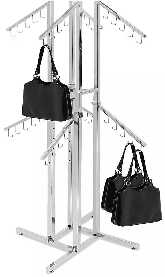 Bags are visible and easy to reach. 4 way, 8 arm rack. 5 hooks per arm for even spacing. 2 tiers for high and low display.