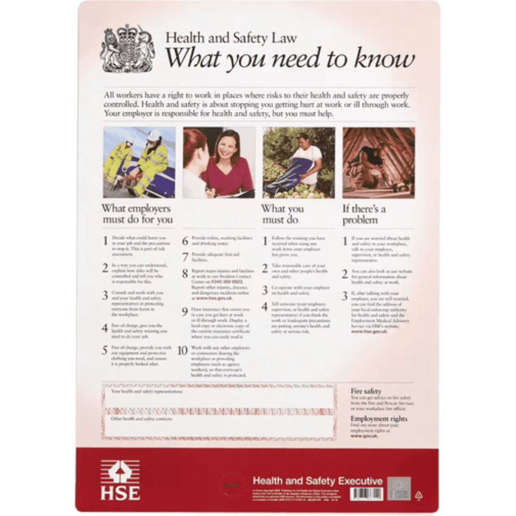 Employers are legally required to display the Health & Safety Law Poster in their workplace or provide each worker with a copy of the equivalent leaflet. This poster informs workplace members what employees and employers duties are and what they must do to follow health and safety laws in the workplace. This is the most recent version of the poster which is printed on a durable material and includes the proper verification hologram to indicate it is a genuine product.
