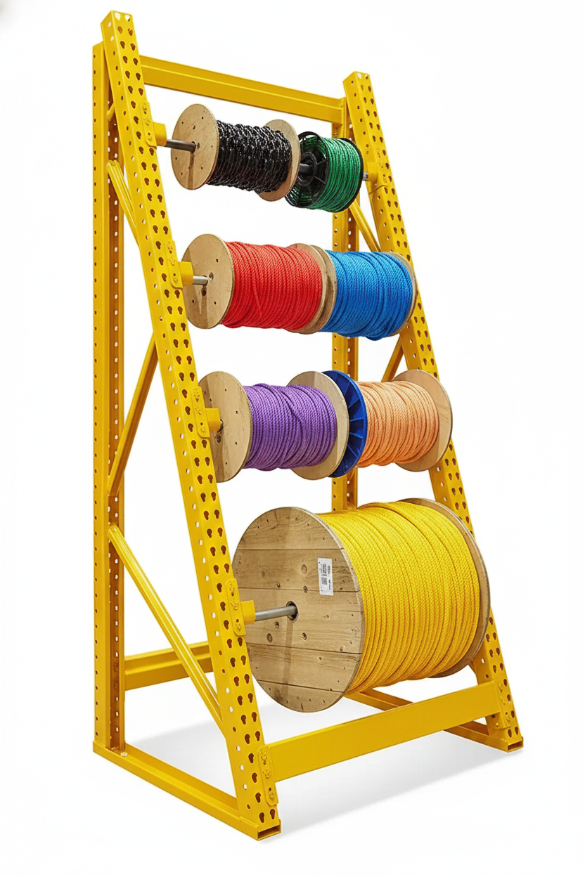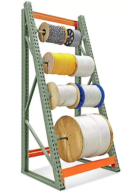 Store and dispense heavy spools of wire, cable, tubing, rope or chain. Heavy duty steel construction holds up to 60″ diameter spools. Axle brackets adjust in 2″ increments. Includes 4 axles. Quick, boltless assembly. Beams easily lock into place.