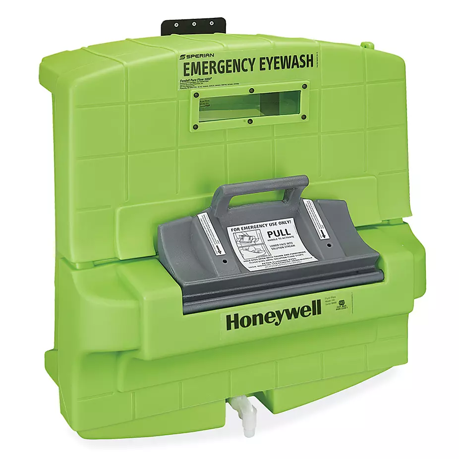 Self-contained unit collects used eyewash solution for easy clean-up.