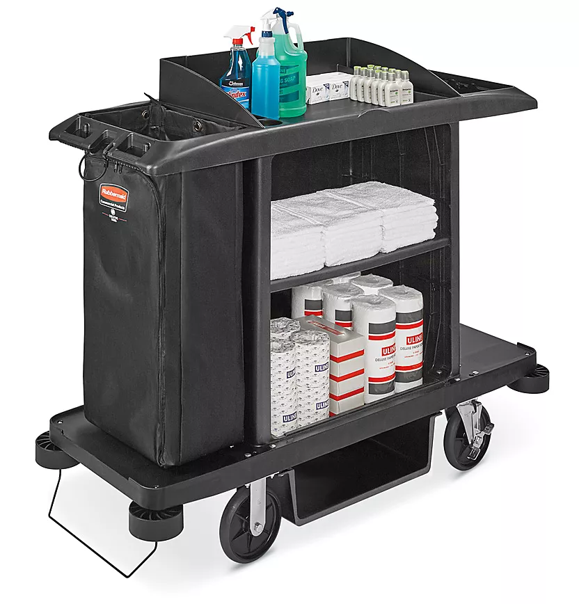 Generous 18 x 30″ shelves hold housekeeping supplies for up to 16 hotel rooms.