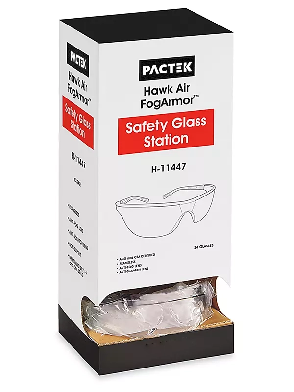 Economical, lightweight, wraparound lenses. Individually wrapped eye protection for guests and staff. FogArmor™ enhanced coating keeps lenses clear and fog-free. No-pinch nosepiece. Anti-scratch lens. Wall mount or countertop use. 99.9% UV protection.