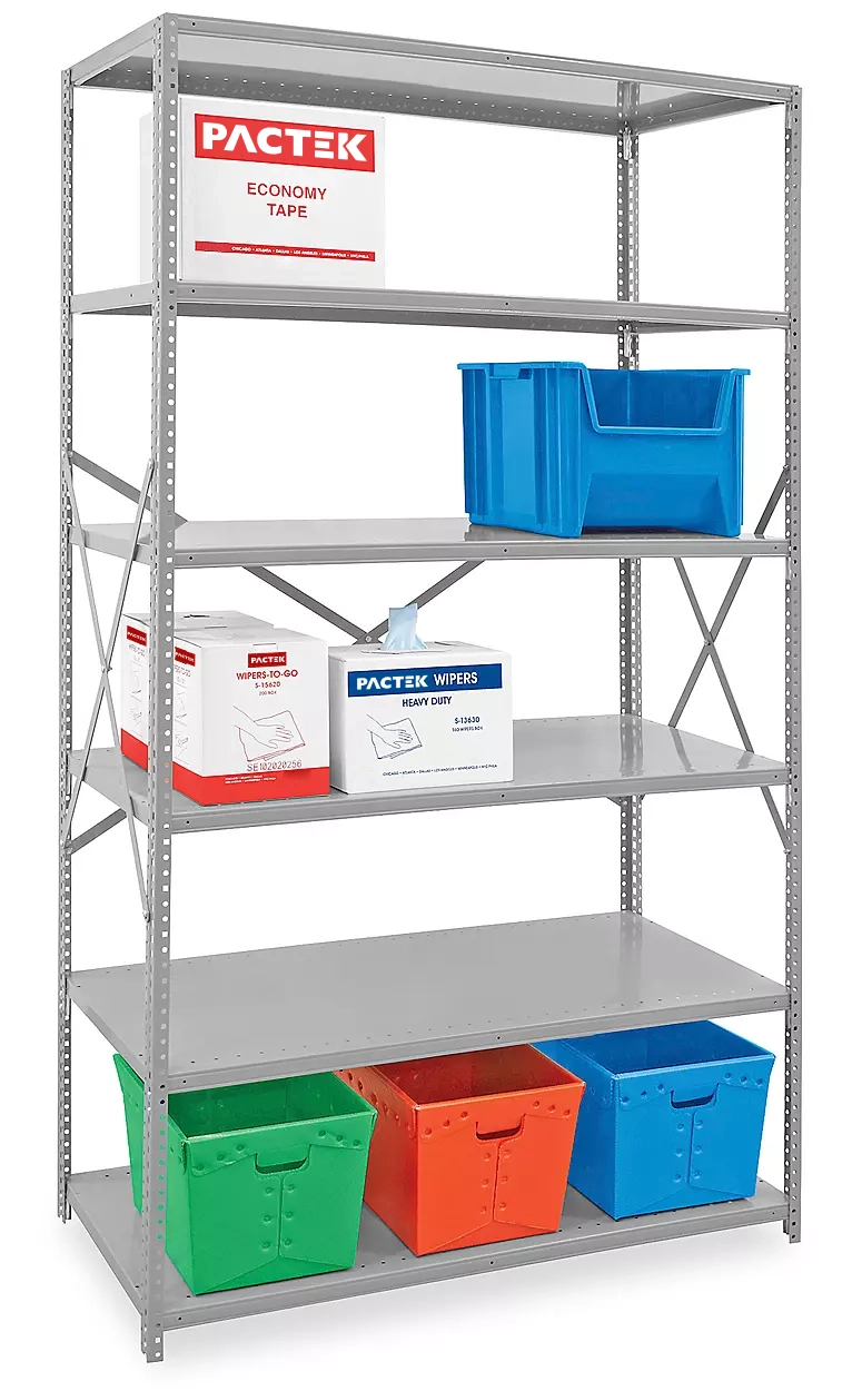 All-purpose steel shelving for warehouses, stockrooms and machine shops.