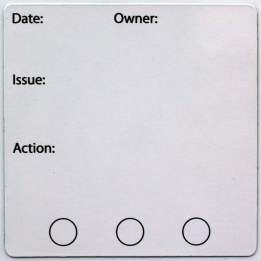 The progress of the issue can be visually tracked using the 3 circles at the bottom of the label by colouring in as they progress. The first stage would be red for issue raised, second would be amber for in progress and the third would be green for completed. Once the issue has been completed these tags can be reused once the dry wipe ink has been removed.