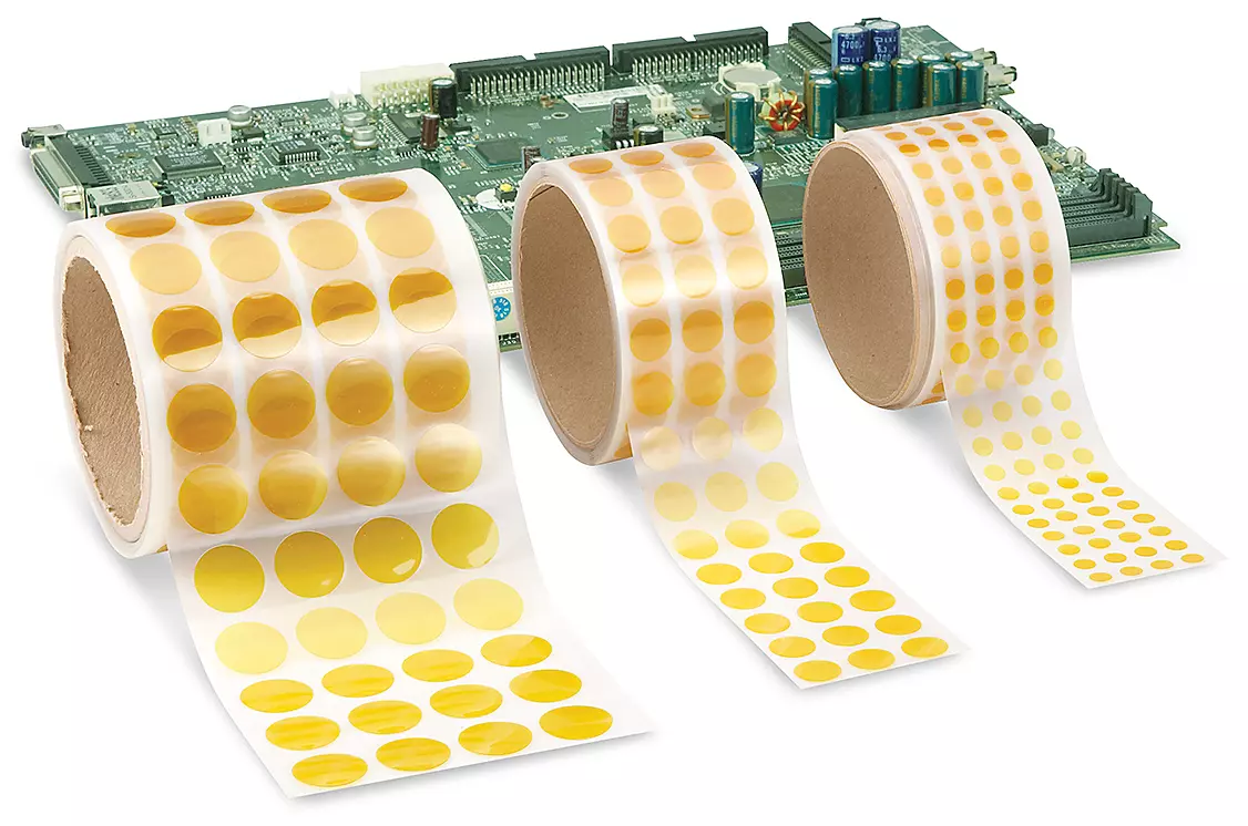 Pre-cut for easily masking small areas on circuit boards. Polyimide film with silicone adhesive. Temperature range up to 500°F. UL 510 flame retardant.
