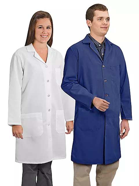Extra long to protect clothes against workplace dirt, dust and grime. Recommended for laboratories, light industrial and food service. Button front, chest pocket, 2 side pockets. Durable, washable poly/cotton blend.