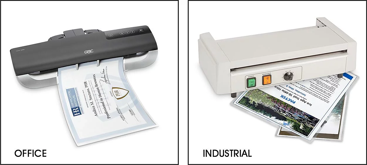 Protect and preserve documents, signs and business cards. Office – For periodic office use. Provides a finished look. Industrial – 3x faster for higher-volume use. A workhorse. For use with Laminating Pouches only, sold separately.