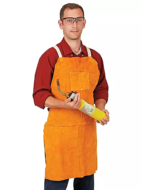 Heavy-duty. For welding, metal and machine shops. Protects against cuts, sparks and abrasions. Flame resistant Kevlar® stitching. Side split cowhide leather with 2 chest pockets.