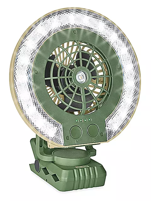 A breeze to use when camping, hiking or working on a project. 4 light settings. 3 fan speeds. 360° clip for mounting. 2 hooks for hanging. Durable ABS plastic. Rechargeable lithium-ion battery with USB-C port.