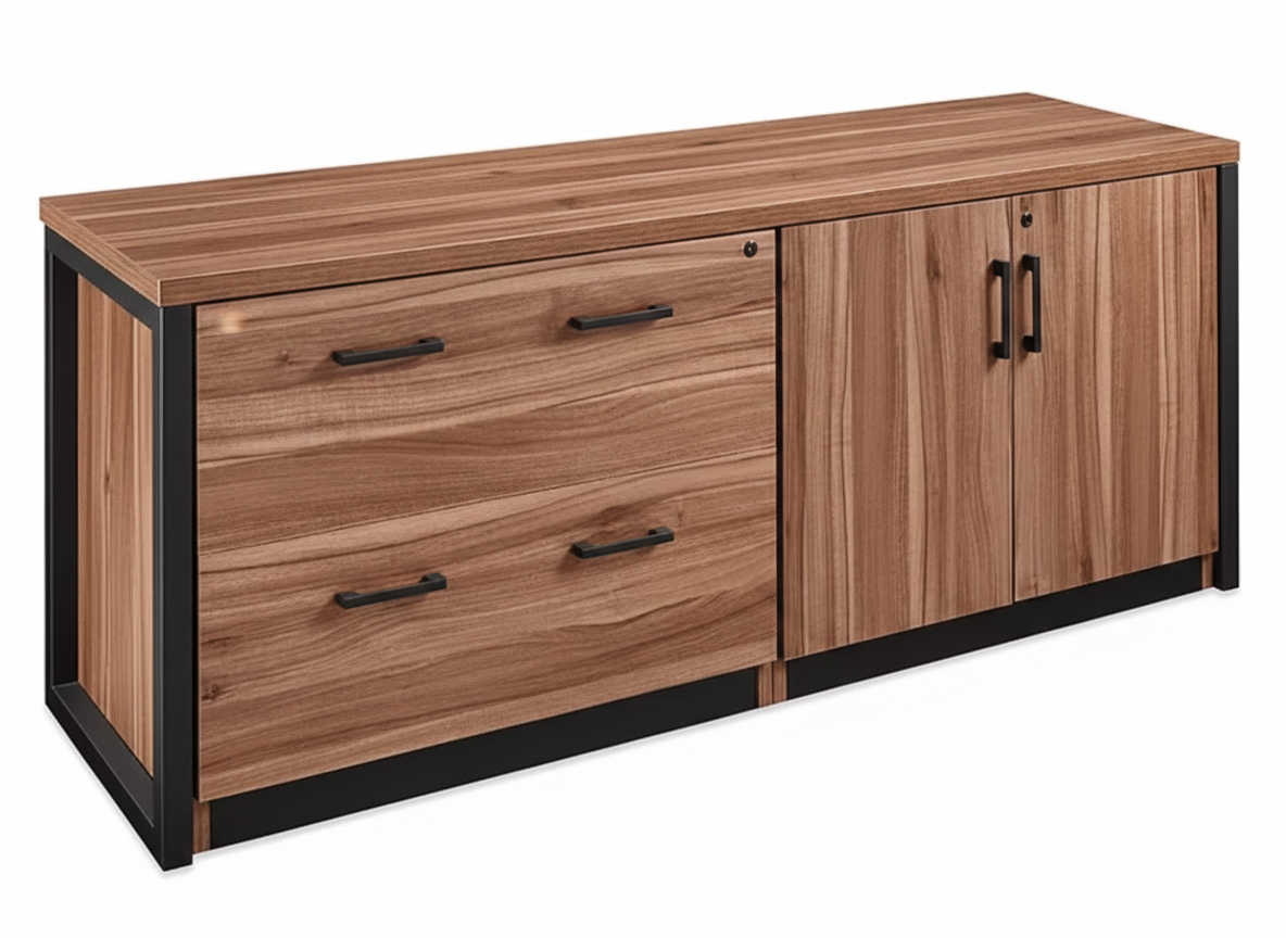 Complete your office space with matching storage. Durable, laminate surface resists scratches, stains and spills. Impact-resistant PVC edges. Store supplies and display décor. 2 file drawers and locking storage cabinet.