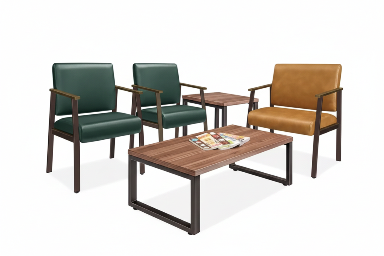 Create an attractive, high-end space for your guests. Stylish, 1 1/2″ thick laminate top resists scratches and spills. Sturdy steel frame with leveling feet. Matching Guest Chairs and Furniture Collection available.