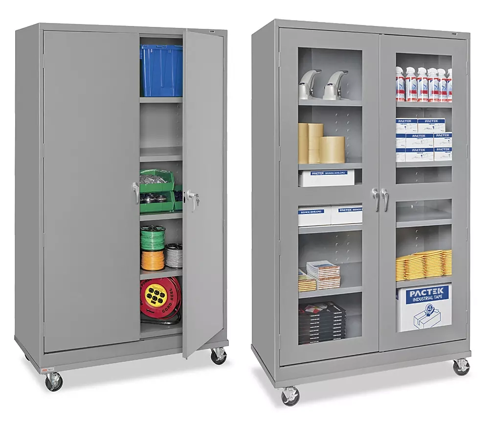 Cabinets roll easily for cleaning and rearranging workspace. Durable steel construction. Powder-coat finish. Shelves adjust in 2″ increments. 750 lb. overall capacity. 3-point locking system. 4″ locking swivel casters. Standard – Conceals contents for security and a clean look. Clear-View – Clear acrylic panels for monitoring inventory.