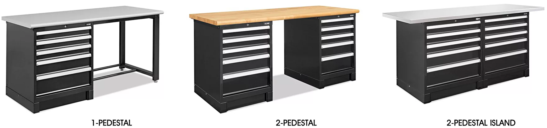 1-Pedestal Workbench – 5-drawer pedestal installs on left or right side.