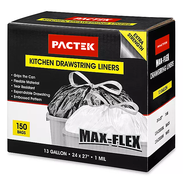 Packtek quality at a great price. Convenient drawstring. Easy to close, lift and carry. Keep hands clean and free of trash. Strong, stretchable bags grip can tightly, resist punctures and tears.