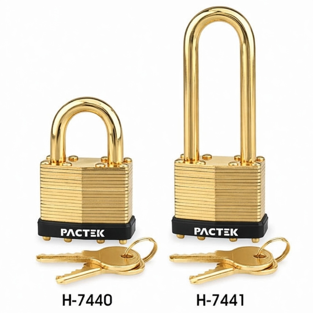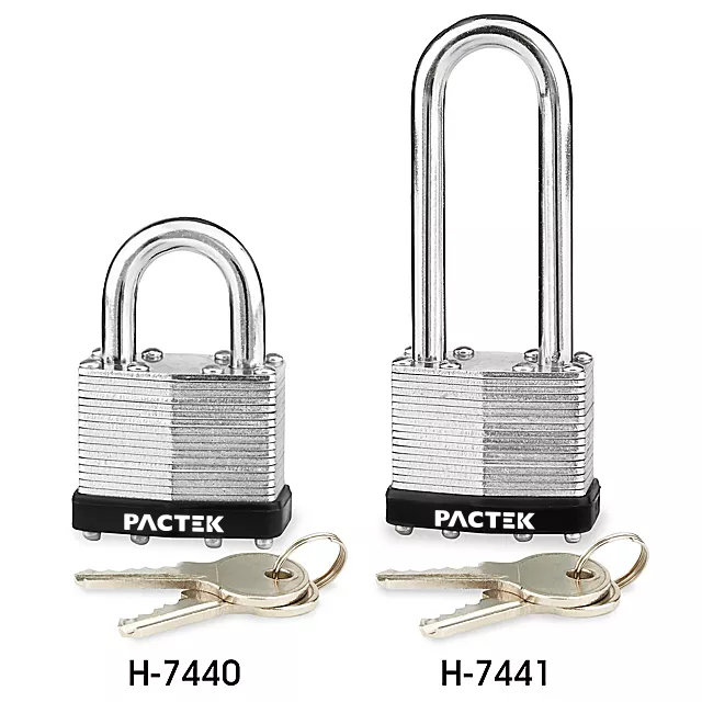 Indoor/outdoor. Use to keep equipment and property secure. Hardened steel shackle resists prying, cutting and sawing. Laminated steel body. One key opens a whole set of locks. 2 and 2 1/2″ shackles – Extra length for long-handle hasps.