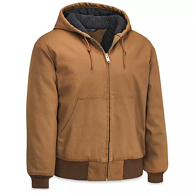Zip front, attached hood, flannel lining, 2 inside, 2 outside pockets.