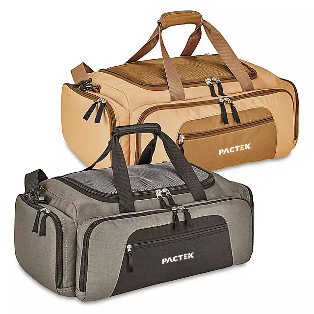 Catch-all bag for the gym or an overnight stay. Weather-resistant polyester. Zip closure with 5 exterior pockets. Firm, reinforced bottom. 1 interior mesh pocket. Padded handle and adjustable shoulder strap.