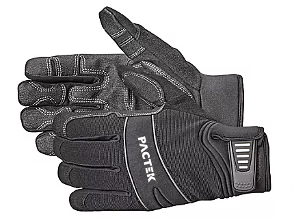 Waterproof fleece liner keeps hands warm and dry. Use in temperatures down to 20°F. Reinforced synthetic leather palm. Insulated liner tightens fit, recommended to order