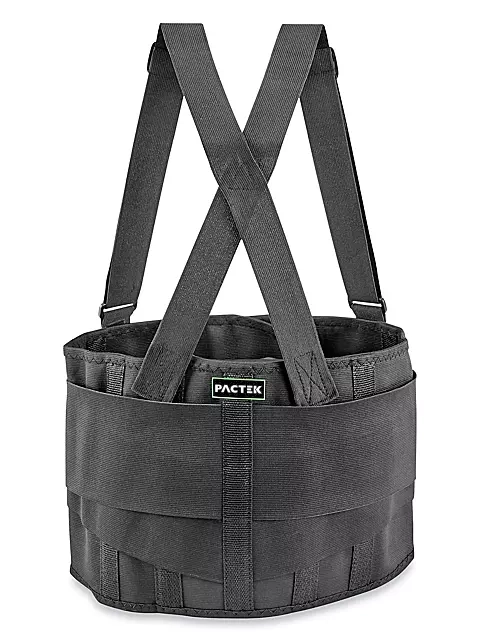 Flexible, ventilated elastic belt. Removable, adjustable shoulder straps. Inner supports prevent belt from curling over. Durable and machine washable.
