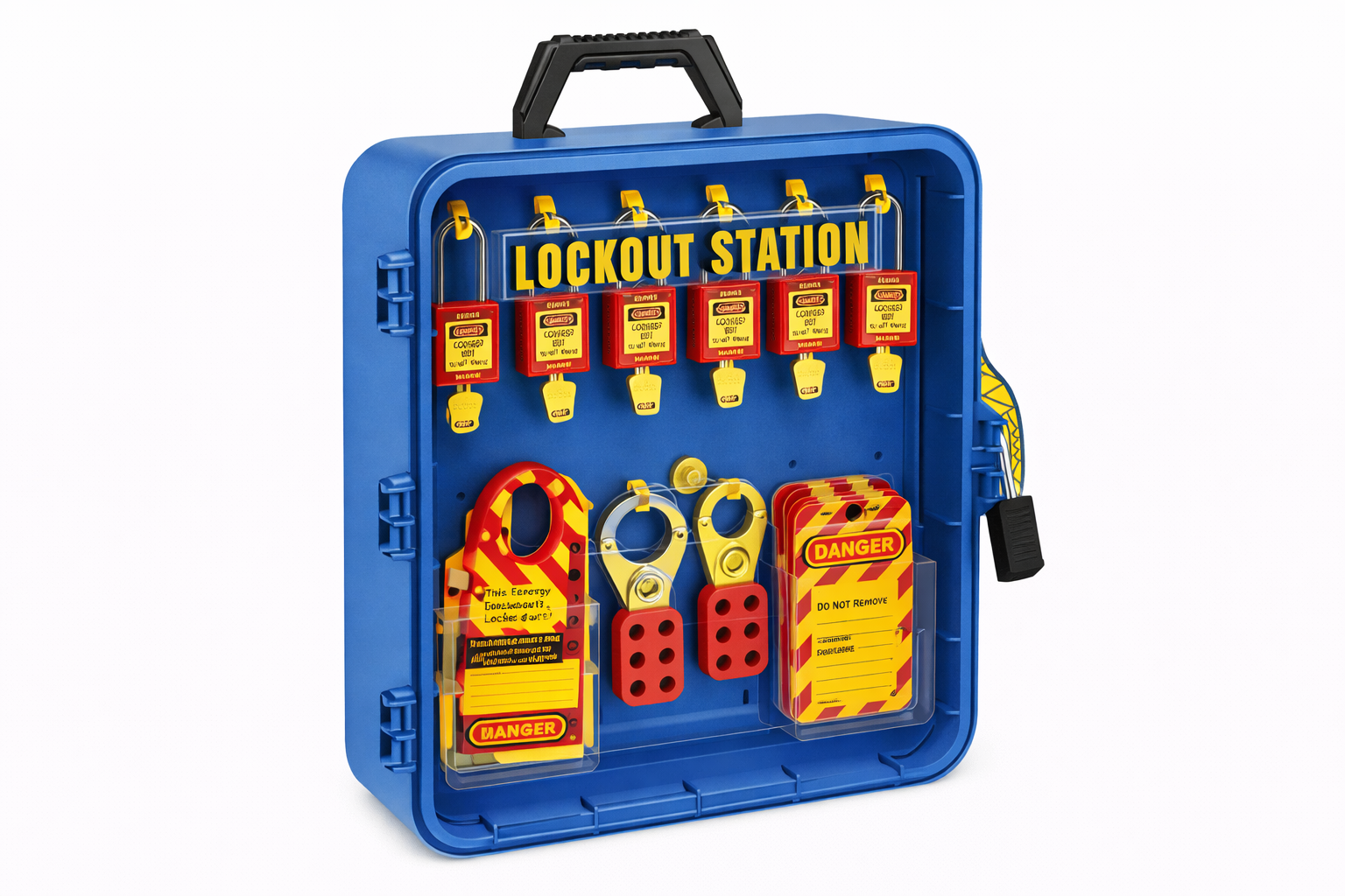 Includes: (12) Keyed-Different Padlocks (4) Hasps (2) Snap-On Hasps (24) Tags (1) Station Lock Wall Mounting Hardware