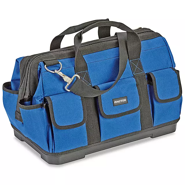 Outfit your entire crew. Heavyweight polyester with rigid plastic bottom. Super wide opening. Shoulder strap included. 16 pockets – 6 inside, 10 outside.