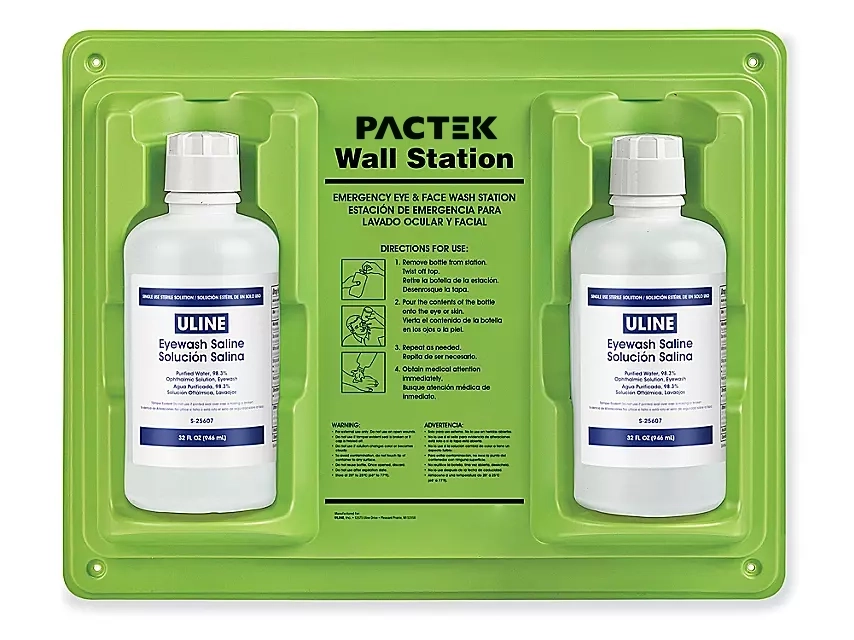Quickly flush your eyes in emergency situations before you locate a primary eyewash station. Includes: Starter bottle(s) of saline solution, wall-mount station and hardware.