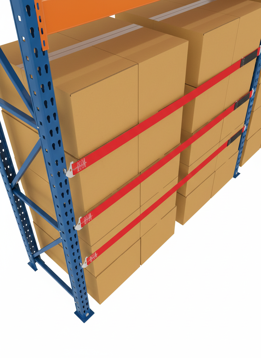 Prevent dangerous product fall throughs. Tough polyester webbing. Elastic expander allows 6″ of overhang. Easy to install, remove or relocate. End fittings lock into slots on teardrop style uprights.