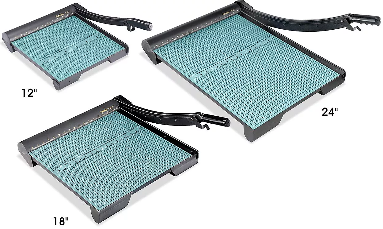 Cuts papers, matboard and cardboard. Self-sharpening steel blade. No replacement needed. Safety guard protects fingers. Cuts up to 15 sheets at a time. Stable wood base with non-slip rubber feet.