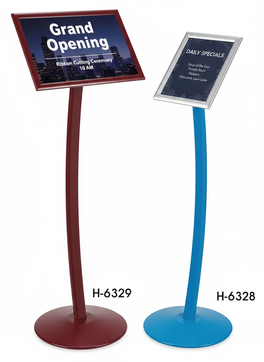 Sleek, curved displays get noticed in lobbies, galleries and cafés. Frame edges flip open for quick changes. Easily rotates from portrait to landscape position. Non-glare plastic cover protects signs and posters.
