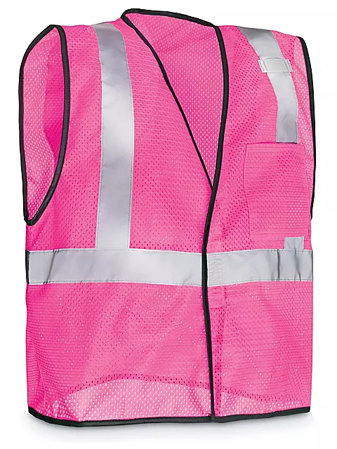 Think pink! Recommended for warehouse staff, parking attendants or landscapers. Breathable polyester mesh. Hook-and-loop closure. Machine washable. Striping gives extra visibility in dark or low light areas. Left chest pocket with mic tab.