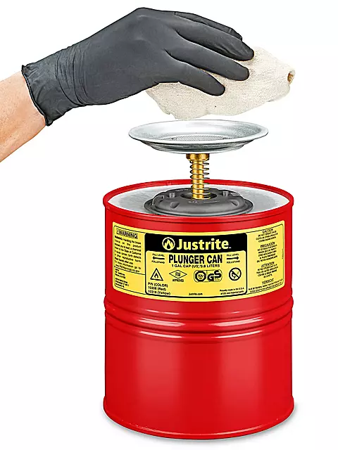 Safely clean small parts with flammable liquids in metalworking plants and service centers. Push plate down to moisten cleaning cloths and swabs. Excess liquid drains back into can. Durable 24-gauge steel with powder-coat finish.
