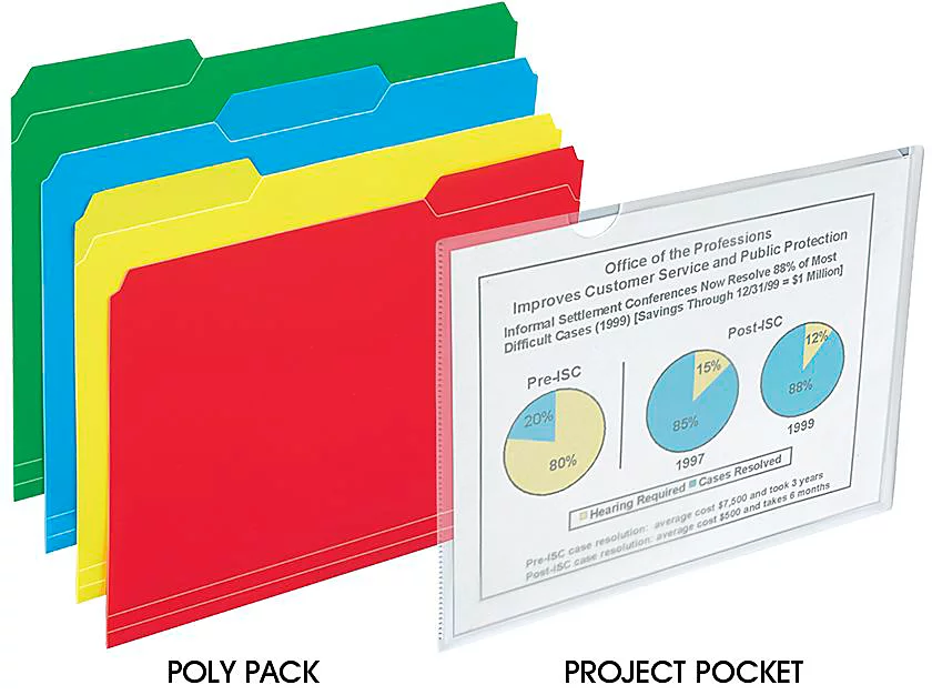 Tough, strong and quickly identifiable. Reusable. Adhesive labels remove easily. Wear, tear and moisture resistant. Assorted Poly Pack – 6 each of Red, Yellow, Blue and Green. Frosted Project Pocket – Provide a clear view of your paperwork.